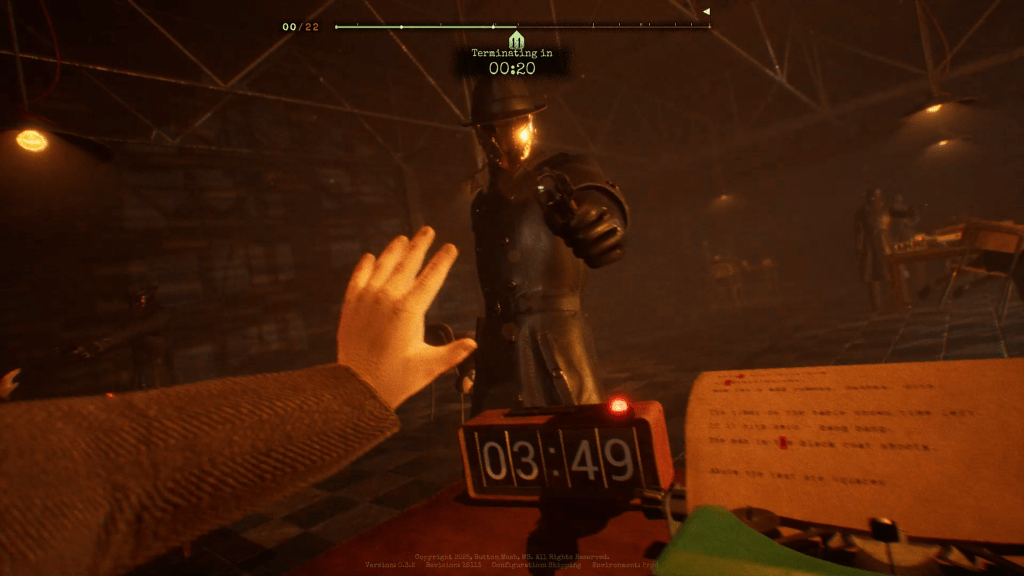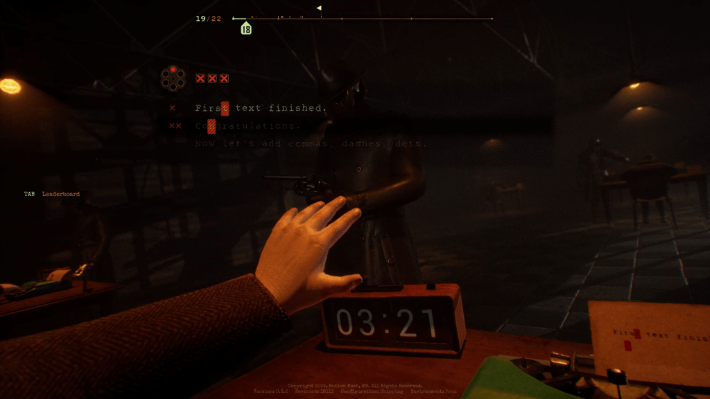 The game’s visuals are gritty and industrial, with flickering lights and echoes of footsteps surrounding you in the hangar. The sound design adds to the pressure, with the clack of keys and the ominous click of a revolver marking your every move.